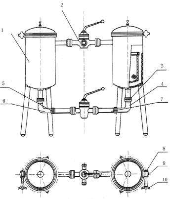 1、φ300過濾器 2、三通外螺紋旋塞 3、圓螺母 4、直角彎管  5、光接頭  6、螺紋接頭 7、管子 8、棱形螺母 9、接緊螺栓 10、手柄