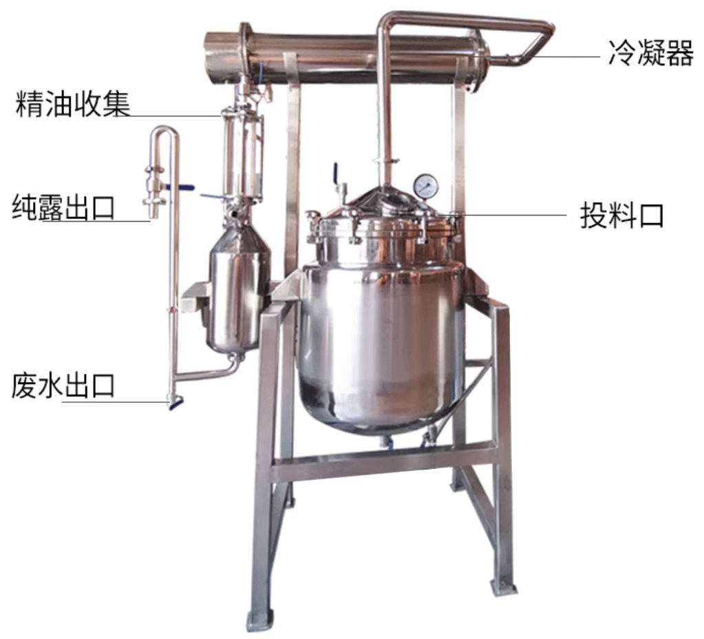 個大的不銹鋼蒸餾容器 ( 蒸餾器 ), 在容器 底部加熱 或 通入蒸汽。當炙熱的蒸氣充滿在容器里,會將植物內(nèi)存的芳香精油成分隨著水蒸氣蒸發(fā),并且隨著水