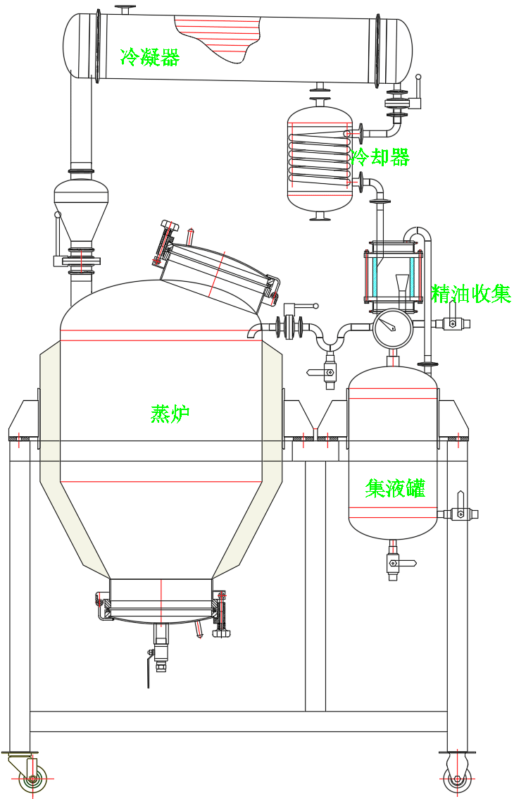 分離器,將精油分離出來,收集精油純露,或水流回提取機進行循環(huán)蒸餾,直至提取機內(nèi)物料將油全部蒸出,停止加熱,排空出渣。