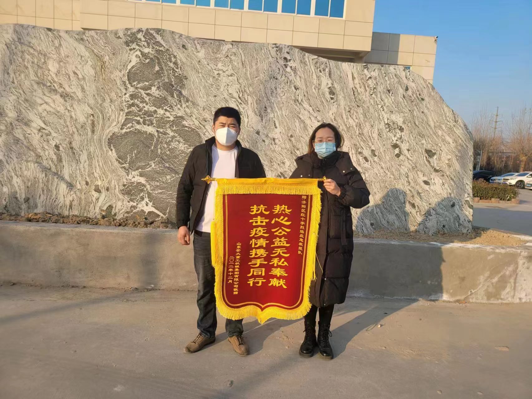 近日,山東安大重工機械集團有限公司贈送一面印有“熱心公益無私奉獻 抗擊疫情攜手同行”的榮譽錦旗到濟陽區(qū)紅十字會烈焰應(yīng)急救援隊,以表對烈焰應(yīng)急救援隊志愿者們的衷心感謝。